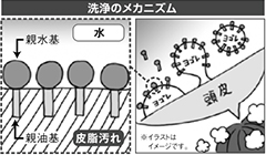 洗浄成分は「界面活性剤」とも呼ばれます。その働きは、水と油という二つの物質が混じり合うように、境界面の性質を変えること。水に馴染みやすい部分(親水基)と油に馴染みやすい部分(親油基)とを持った分子が水と皮脂汚れをしっかり吸着させ、頭皮から浮かし取ります。